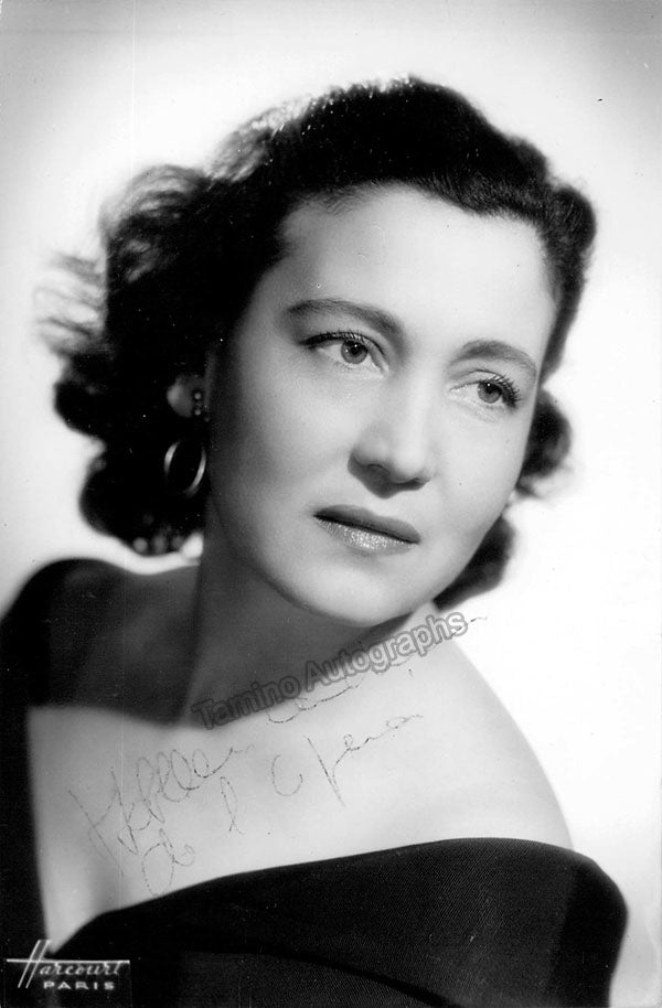Signed photograph, shown as herself, inscribed. Printed signature on front of photographer Harcourt, Paris. Size is 4 x 5.75 inches, slight paper loss on edges, otherwise in excellent condition.