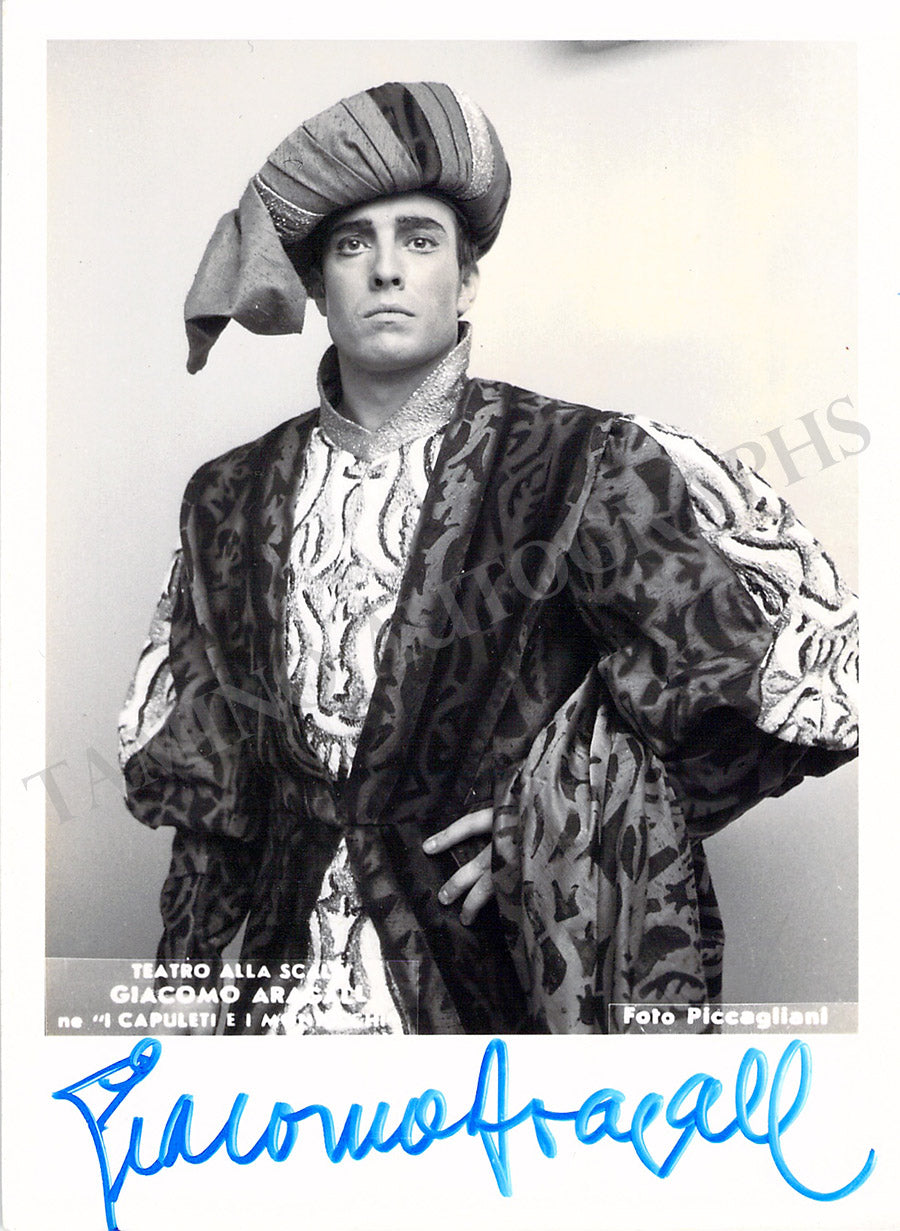 Beautiful black-and-white promo photograph signed by him, shown as Romeo for a production of Bellini's I Capuleti e I Montecchi at Teatro La Scala (Milan). Size is 4.1 x 5.75 inches, in excellent condition.