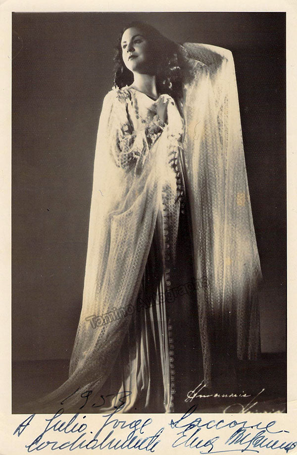 Argentinian soprano whose birth name was Helena Arizmendi (1927–2015), performed frequently at the Teatro Colon as well as in Italy. Signed photograph, shown in role, inscribed. Stamped on verso by Carmen photographers, Buenos Aires. Size is 4.5 x 6.75 inches, small creases and bends, otherwise in very good condition.