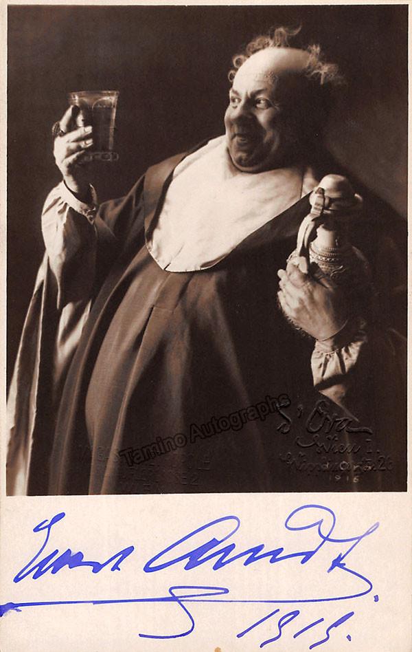 Austrian singer and composer (1890-1962), signed photo postcard, shown in role, (probably in Falstaff), dated in 1919. Stamped on front by photographer Magasin Metropole, Vienna. Size is 3.25 x 5.25 inches.