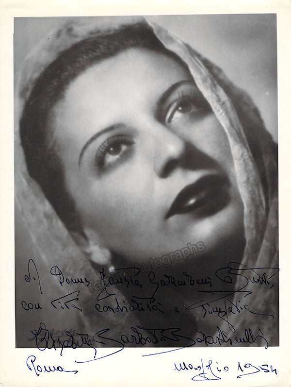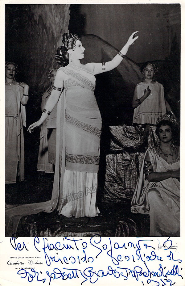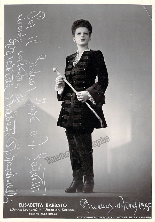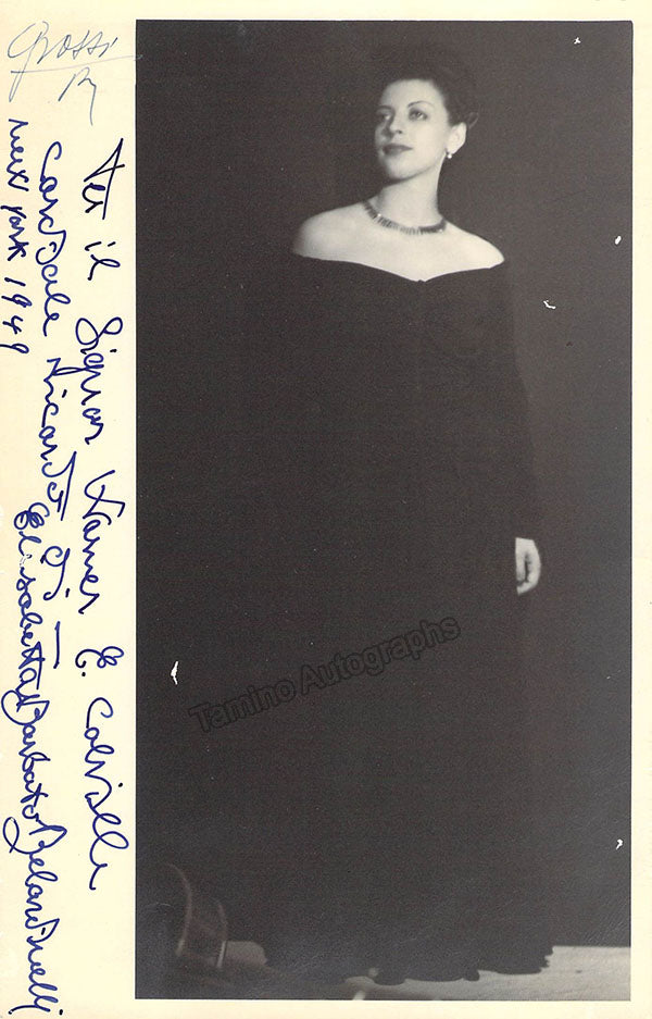 Signed photograph, shown as Leonora in Verdi's La Forza del Destino, inscribed in Buenos Aires and dated in 1950. Photo by M. Camuzzi, La Scala, Milan. Size is 4 x 6 inches, small crease on top right, otherwise in excellent condition.
