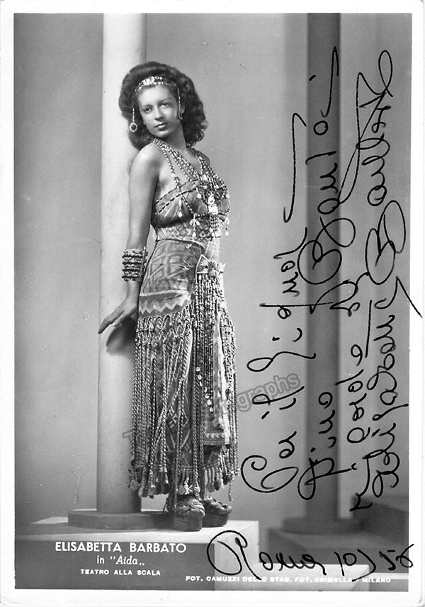 Signed photograph, shown in the title role of Verdi's Aida, inscribed in Rome and dated in 1956. Photo by M. Camuzzi, La Scala, Milan. Size is 4 x 5.75 inches, some mounting traces on verso, otherwise in excellent condition.