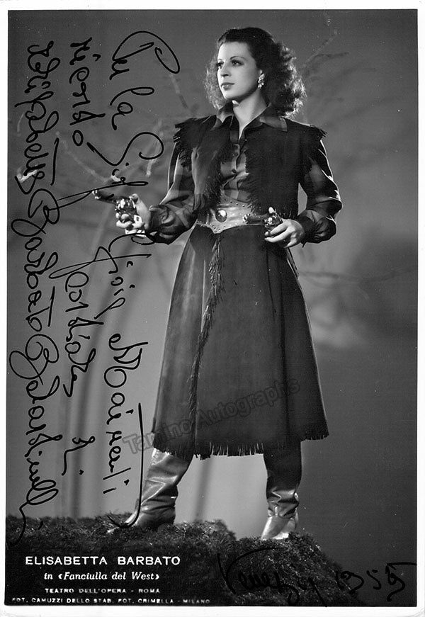 Signed photograph, shown as Minnie in Puccini's La Fanciulla del West, inscribed, dated in Venice in 1955. Photo by M. Camuzzi, size is 4 x 5.75 inches, in excellent condition.