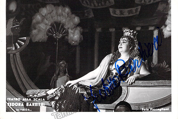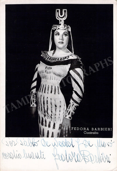 Signed photograph, shown as Amneris in Verdi's Aida at La Scala, Milan. Photo by Piccagliani, Milan. Size is 4 x 5.75 inches, in excellent condition.