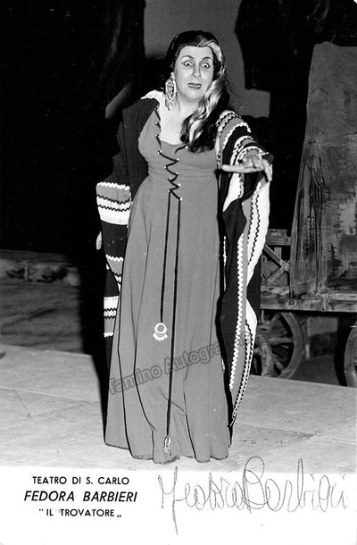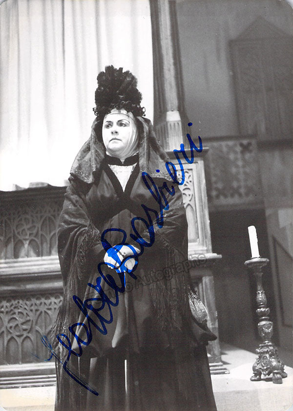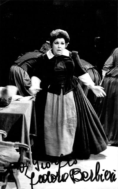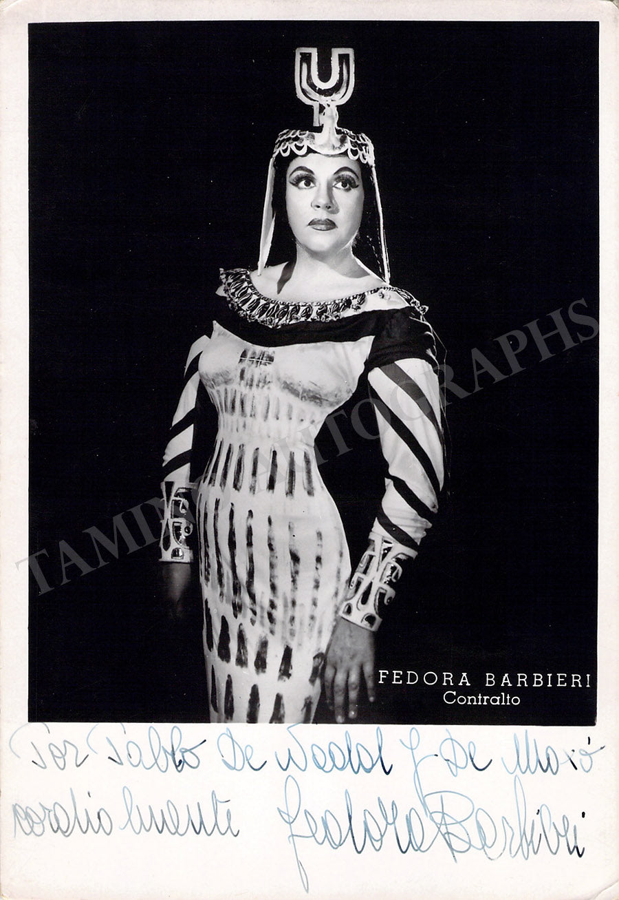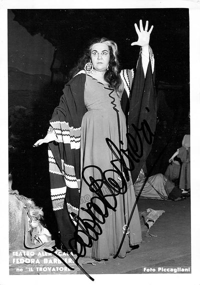 Black-and-white promo photograph by Erio Piccagliani signed and inscribed by Barbieri with a short sentiment in Italian, shown as Ulrica in Verdi's Un Ballo in Maschera at Teatro alla Scala, Season 1959-1960. Size is 4.1 x 5.75 inches, in excellent condition.