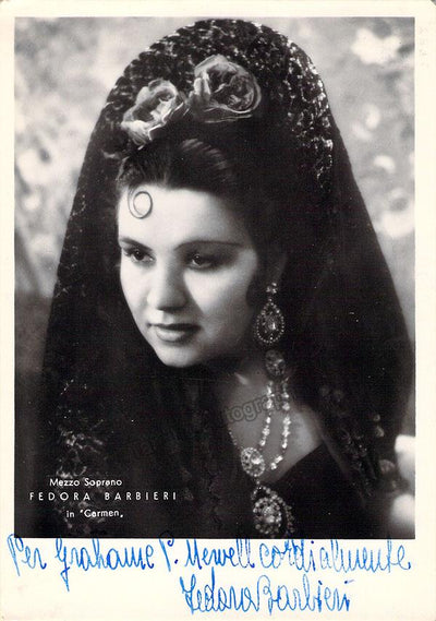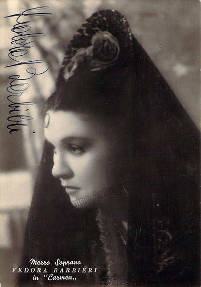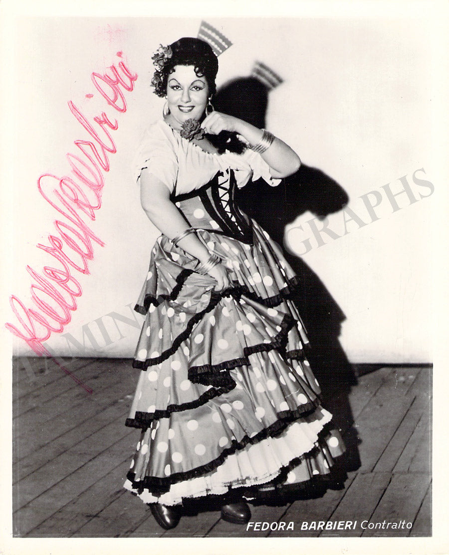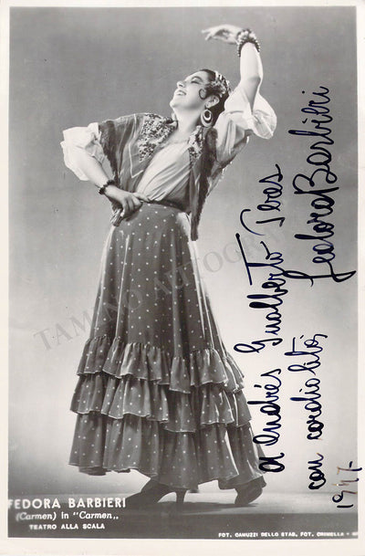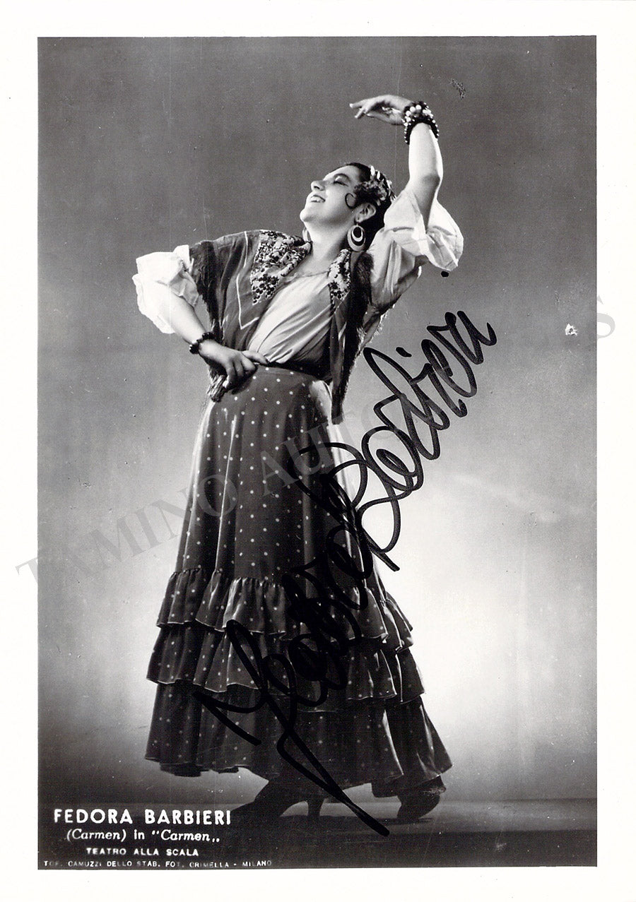 Signed photograph, shown in the title role of Bizet's Carmen, inscribed and dated in 1947. Photo by M. Camuzzi, La Scala, Milan. Size is 4.5 x 7 inches, several very small creases on bottom corners, otherwise in excellent condition.