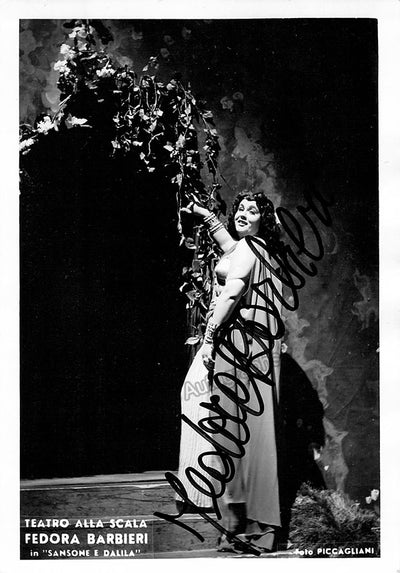 Signed photograph, shown as Dalila in Saint Saen's Samson et Dalila. Photo by Piccagliani, La Scala, Milan. Size is 4 x 5.75 inches, some bends, otherwise in good condition.