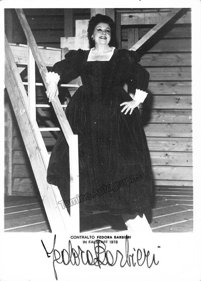Nice black-and-white photograph mounted on a promotional cardboard frame signed by her, shown as Mrs. Quickly in Verdi's last opera Falstaff. Total size is 5.1 x 7 inches, in very good condition.