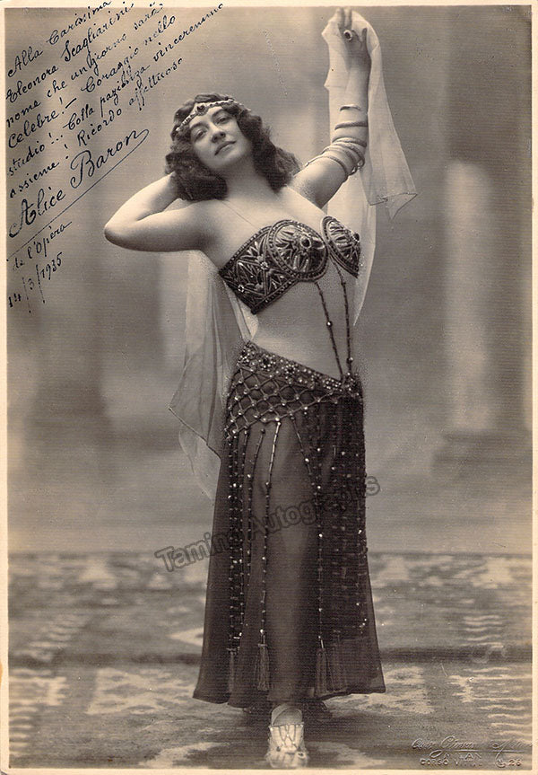 French soprano, active in the early twentieth century, signed photograph, shown in the title role of Richard Strauss's Salome, inscribed with sentiment, dated in Paris in 1935. Blind stamped on front and stamped on verso by Artico photographers, Milan. Size is 6 x 8.675 inches, in excellent condition.