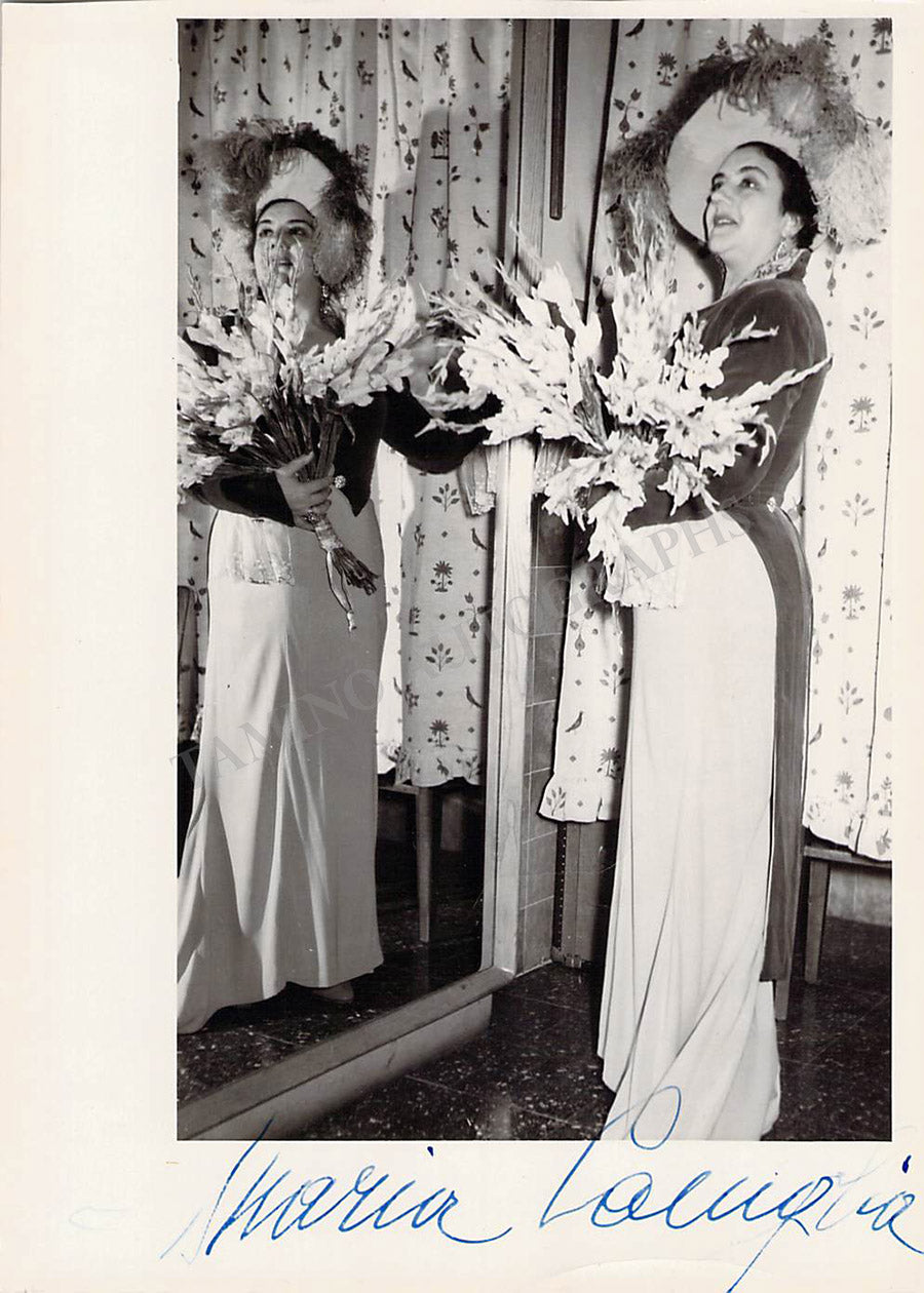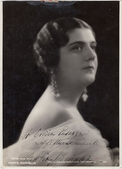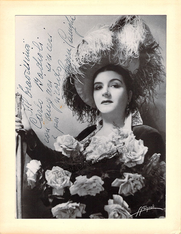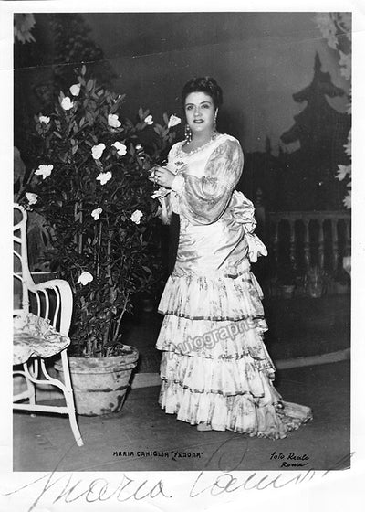 Signed photograph, shown in the title role of Giordano's Fedora. Photo by Foto Reale photographers, Rome. Size is 4.75 x 6.75 inches, some creases and bends, but in generally good condition.