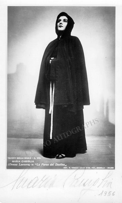 Signed photograph, shown as Leonora in Verdi's La Forza del Destino, dated in 1956. Photo by M. Camuzzi, La Scala, Milan. Size is 4.25 x 7 inches, some creases and bends, in otherwise very good condition.