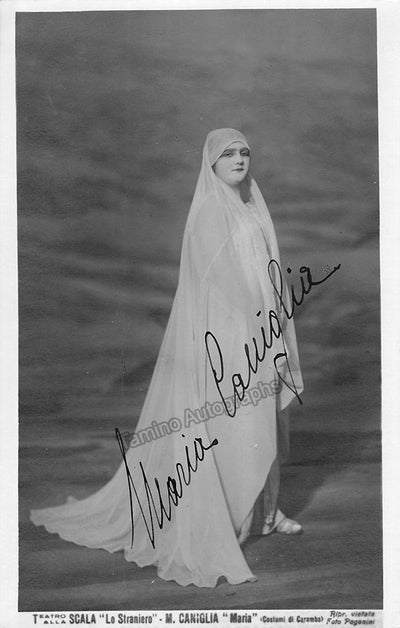 Signed postcard photograph, shown in role in Bellini's La Staniera at Teatro La Scala. Bold handwriting and signature. Photo by Paganini, Milan. Size is 3.5 x 5.25 inches, mounting traces on verso, otherwise in excellent condition.