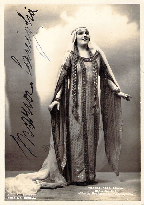 Signed postcard photograph, shown as Elsa in Wagner's Lohengrin. Photo by M. Camuzzi, La Scala, Milan. Size is 4 x 5.75 inches, mounting traces on verso, otherwise in very good condition.