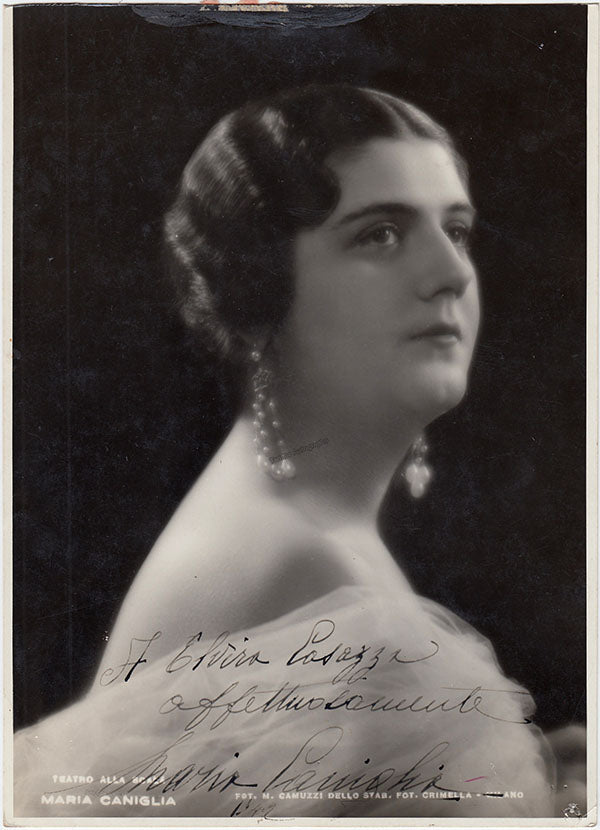 Signed photograph, shown as herself, inscribed. Photo by M. Camuzzi, La Scala, Milan. Size is 6.75 x 9 inches, small bullet hole at bottom right and mounting traces just above the photo, otherwise in very good condition.