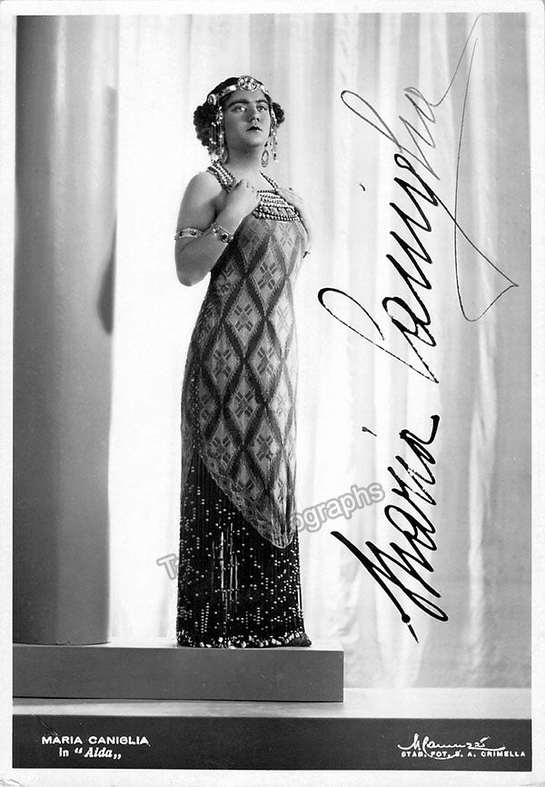 Signed postcard photograph, shown in the title role of Verdi's Aida, at Teatro La Scala. Photo by M. Camuzzi, Milan. Size is 4 x 5.75 inches, in excellent condition.