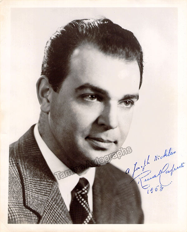 Beautiful black-and-white photograph signed by him and dated 1972, shown as Michelle in Puccini's Il Tabarro; ink-stamped on verso by photographer Troncone (Naples). Size is 5 x 7.1 inches, in excellent condition.