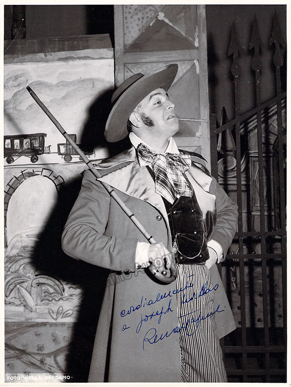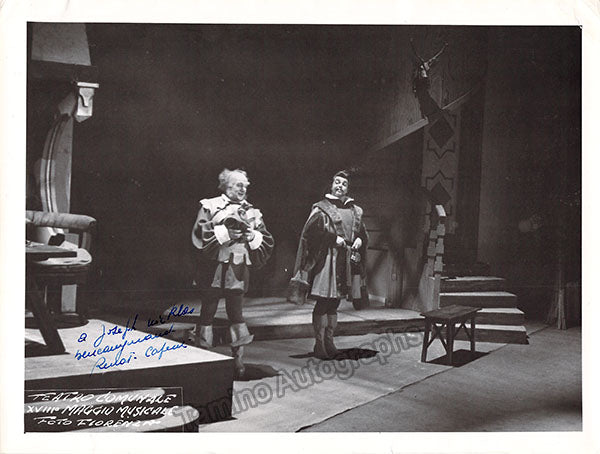 Signed photograph, shown as Ford in Verdi's Falstaff with Tito Gobbi in the title role, inscribed. Stamped on verso by Fiorenza photo studio, Florence. Size is 7 x 9.25 inches, several small creases, otherwise in very good condition.