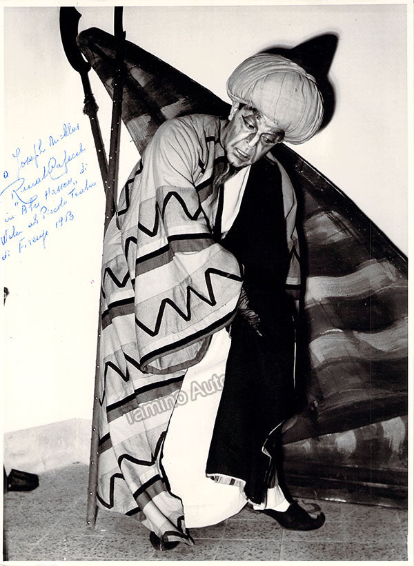 Signed photograph, shown in role, inscribed, and dated in Florence in 1953. Stamped on verso by photographer Levi, Florence. Size is 7 x 9.25 inches, in excellent condition.