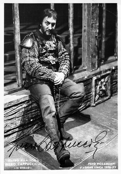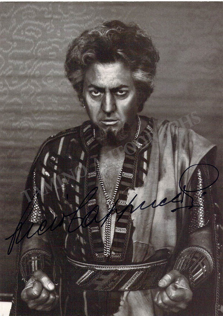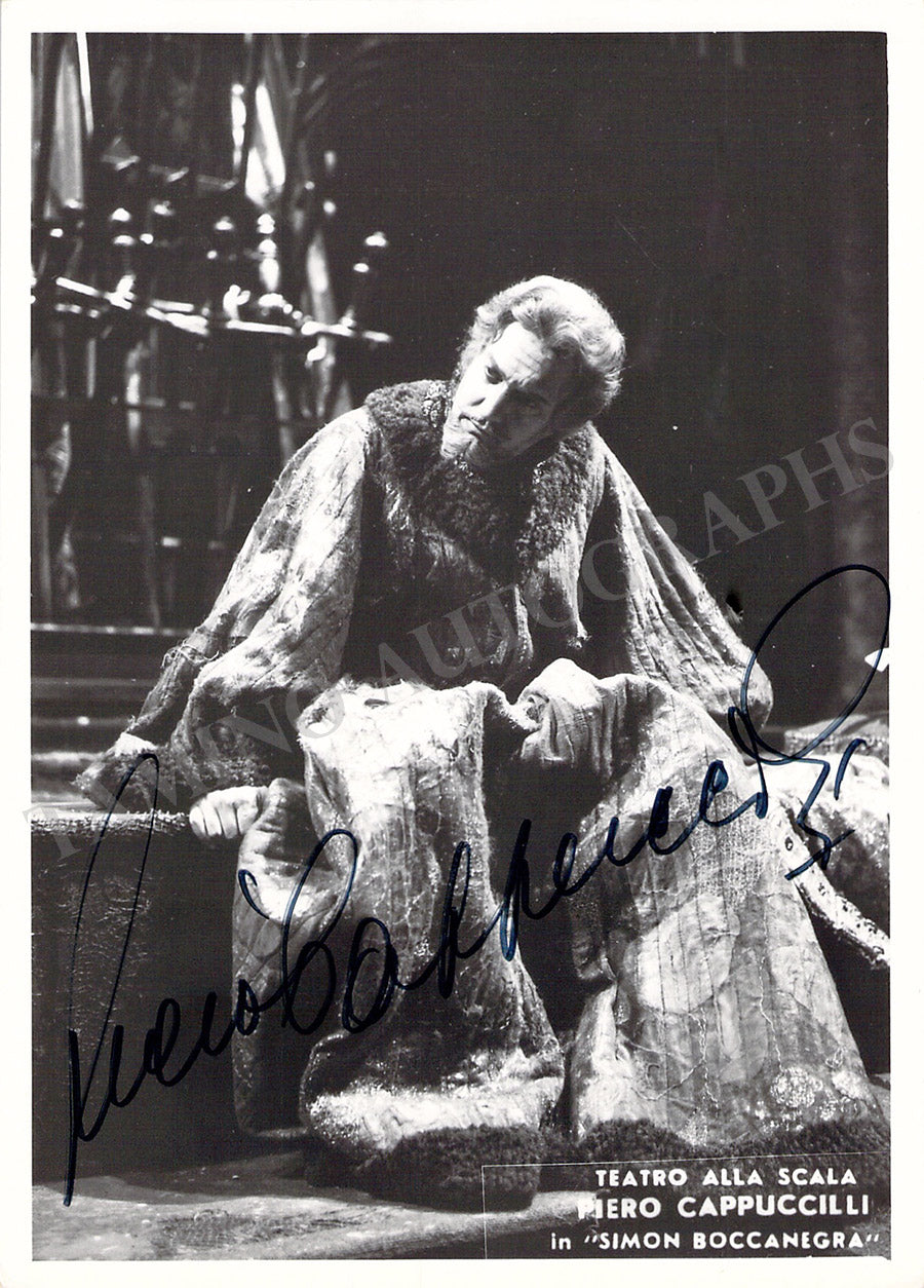 Fine black-and-white photograph signed by him, shown as Simon Boccanegra in Verdi's opera at Teatro La Scala; ink-stamped on verso by photographer Erio Piccagliani. Size is 4.1 x 5.8 inches, in excellent condition.