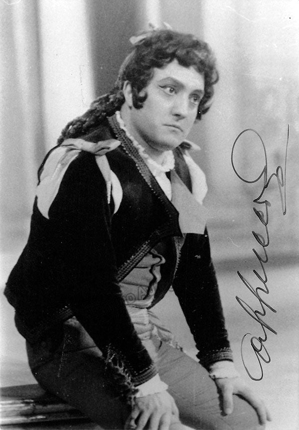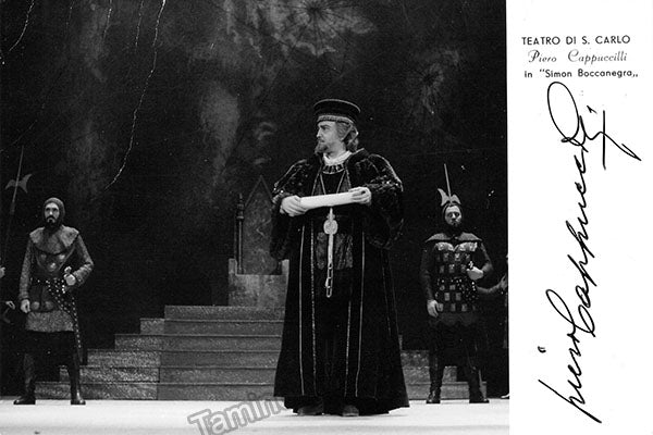 Signed photograph, shown in the title role of Verdi's Simon Boccanegra. Stamped on verso by photographer Troncone. Size is 4.75 x 7 inches, in excellent condition.