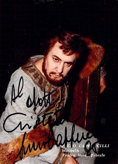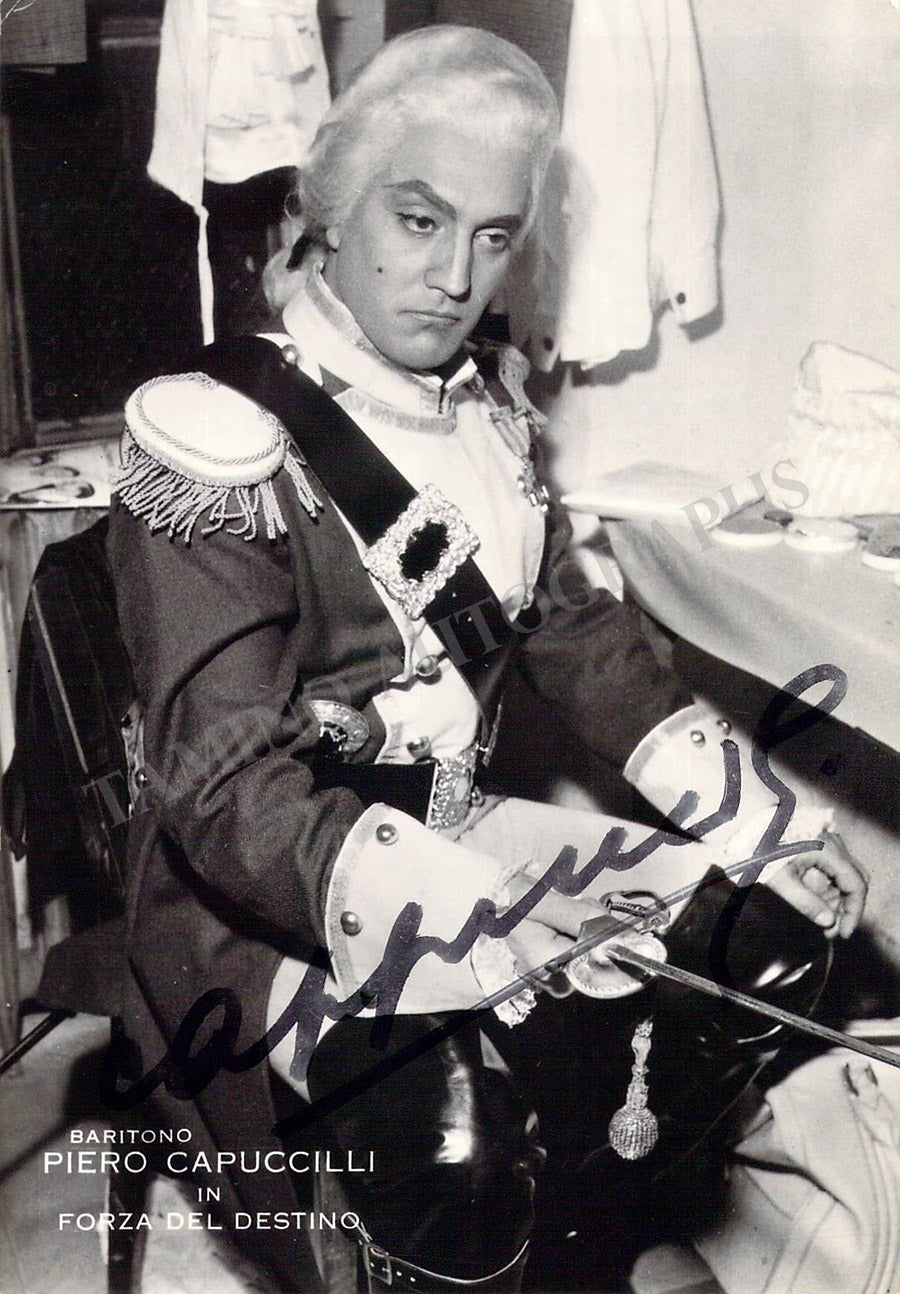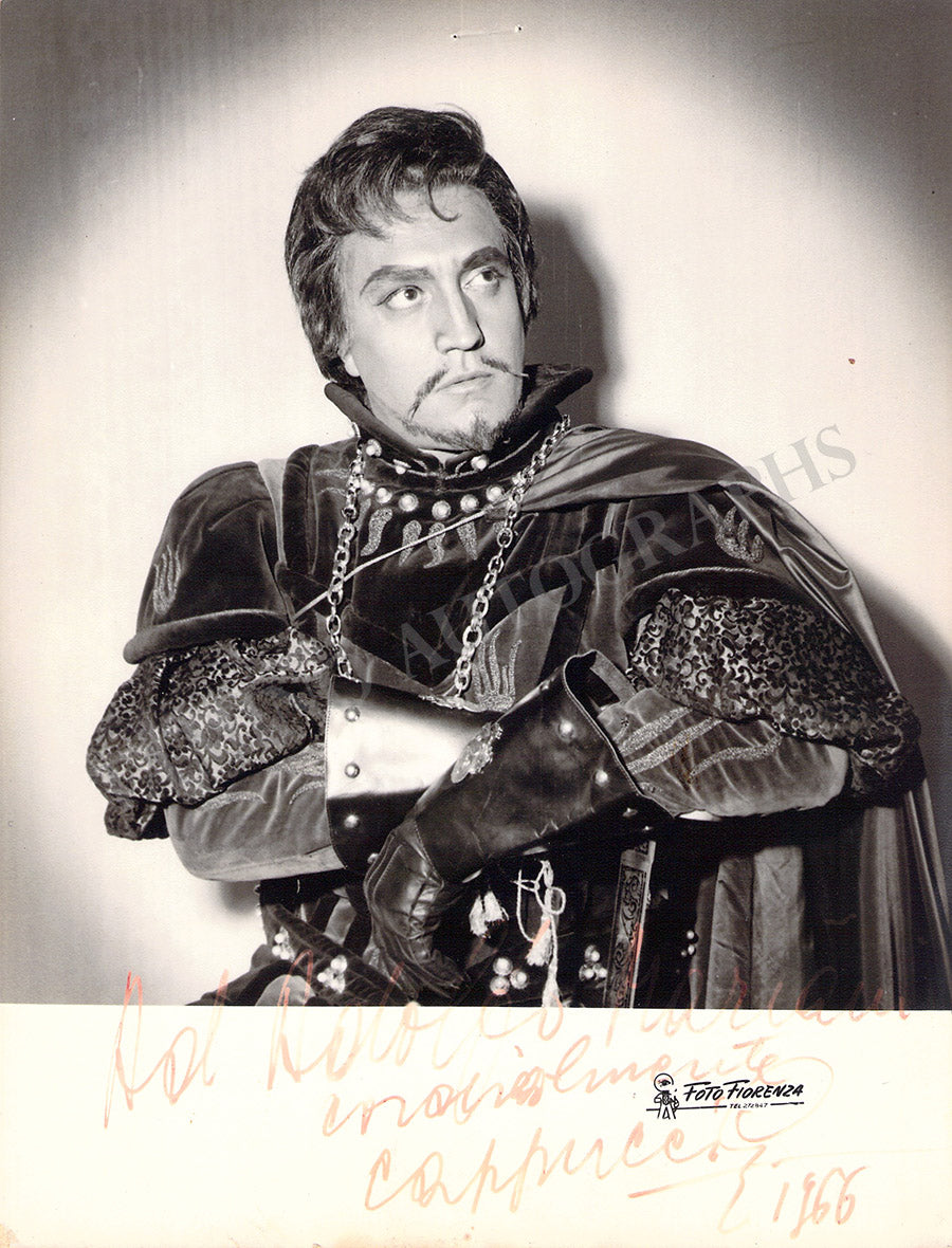 Signed photograph, shown as Don Carlo di Vargas in Verdi's La Forza del Destino. Photo by Foto Flash photographers, Bergamo. Size is 4 x 5.75 inches, very slight paper loss on top right and bottom left corners, otherwise in excellent condition.
