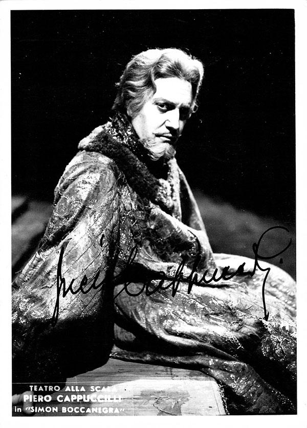 Signed photo, shown in title role of Verdi's Simon Boccanegra, one of his most celebrated interpretations, at La Scala, Milan. Stamped on verso by photographer E. Piccagliani, Milan. Size is 4 x 5.75 inches, in excellent condition.