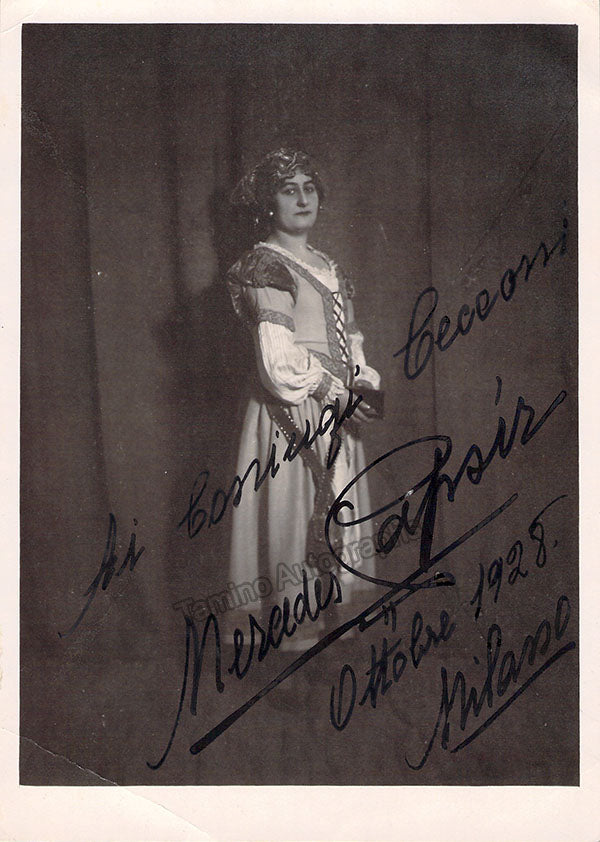 Signed photograph, shown as Norina in Donizetti's Don Pasquale, inscribed with sentiment and dated in Rome in 1932. Bold handwriting and signature. Blind stamped on front by photographer Ettore Reale, Rome. Size is 6.25 x 9.5 inches, mounting traces on verso and small crease on bottom right, otherwise in excellent condition.
