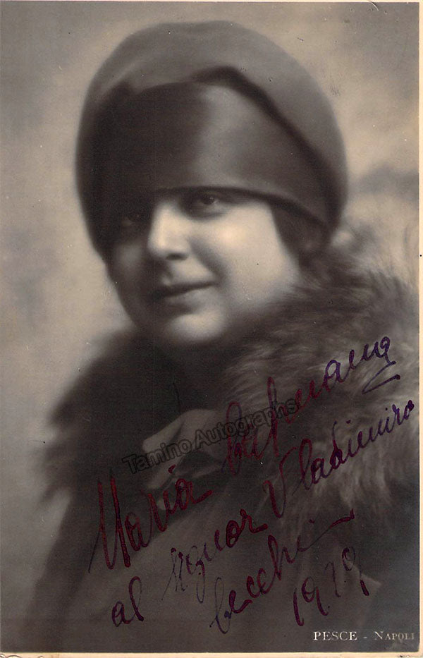 Italian mezzo-soprano/contralto (1891-1955), signed photo postcard, shown as herself, inscribed and dated in 1919. Photo by Alfredo Pesce, Naples. Size is 3.5 x 5.5 inches, in excellent condition.