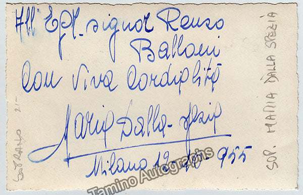 Italian soprano (1925-1992), signed photograph, shown possibly in role. Signed on front with additional signature and inscription on verso, dated in Milan in 1955. Size is 3.5 x 5.5 inches, in very good condition