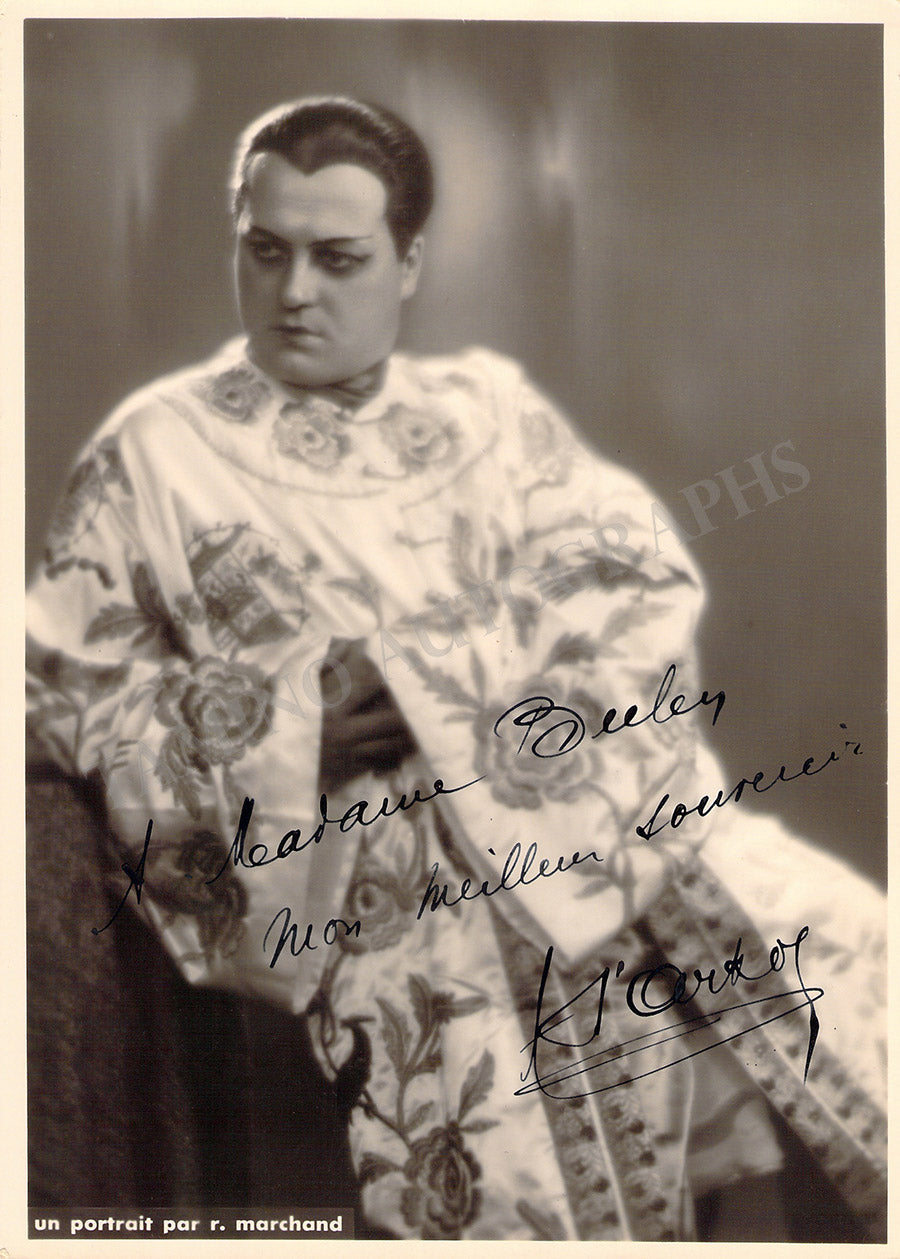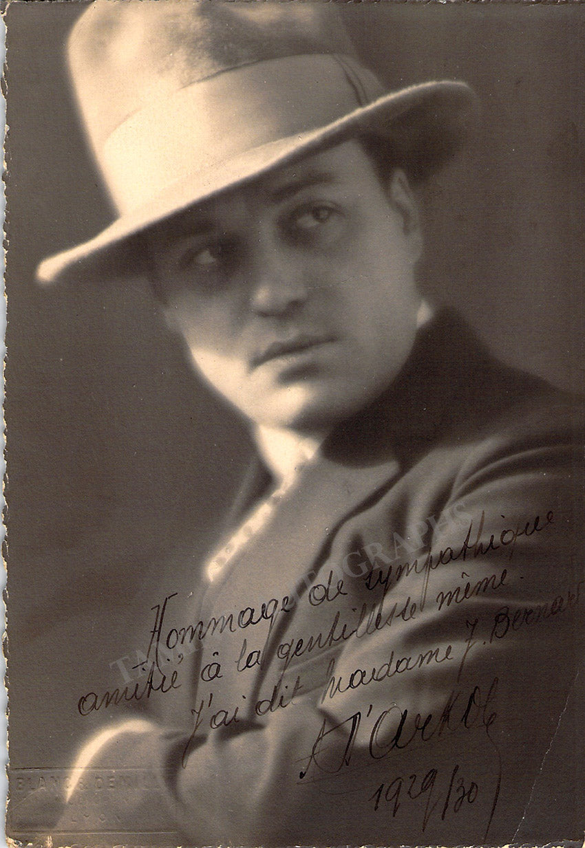 Signed photograph, shown as himself, inscribed, dated in 1929-30. Stamped on verso by photographers Blanc and Demilly, Lyon. Size is 4.5 x 6.5 inches, some mounting traces and jagged edges, but otherwise in good condition.