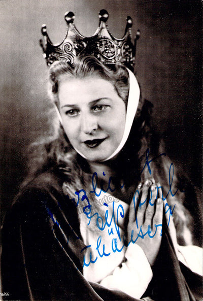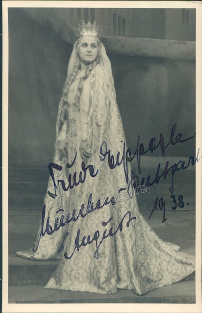 Signed photo postcard shown as Elsa in Lohengrin, dated in 1938 in Munich. Stamped on verso by photographer Hans Holdt, Munich. Size is 3.5 x 5.5 inches, in excellent condition.