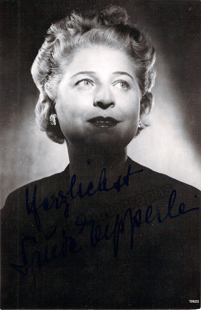 Signed postcard photograph, shown as herself, inscribed. Stamped on verso by photographer Hanns Holdt, Munich. Size is 3.5 x 55. inches, in excellent condition.