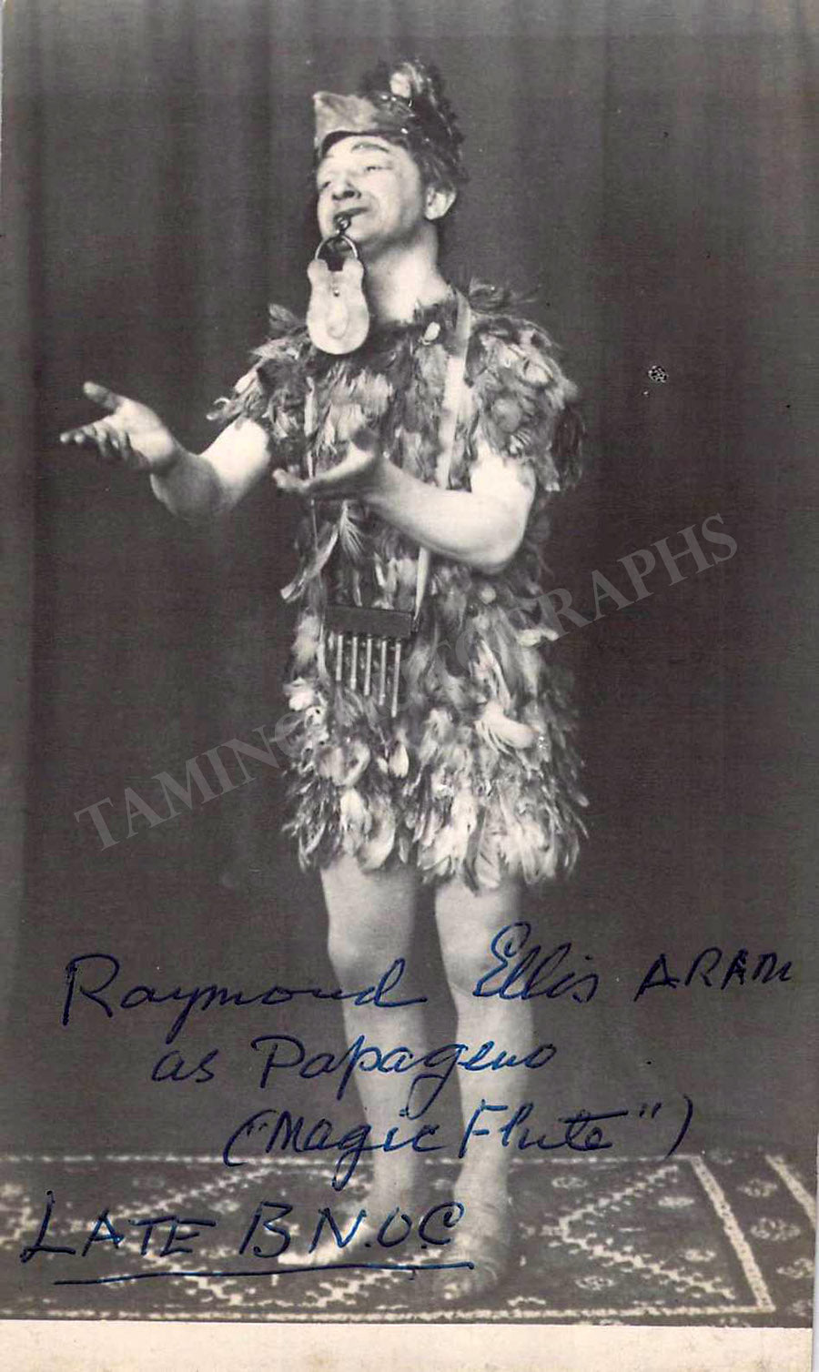 British baritone, active with the British National Opera Company in the early twentieth century. Signed postcard photograph, shown as Papageno in Mozart's Die Zauberflote, size is 3.25 x 5.25 inches, in very good condition.