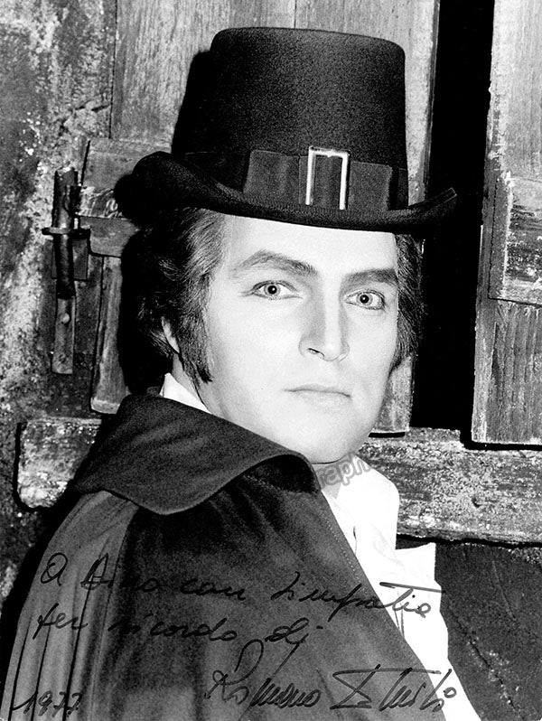 Italian tenor (b. 1937), signed photograph, shown in role, inscribed, dated in 1977. Stamped on verso by photographer Straub. Size is 6.75 x 9 inches, small crease on bottom right, otherwise in excellent condition.