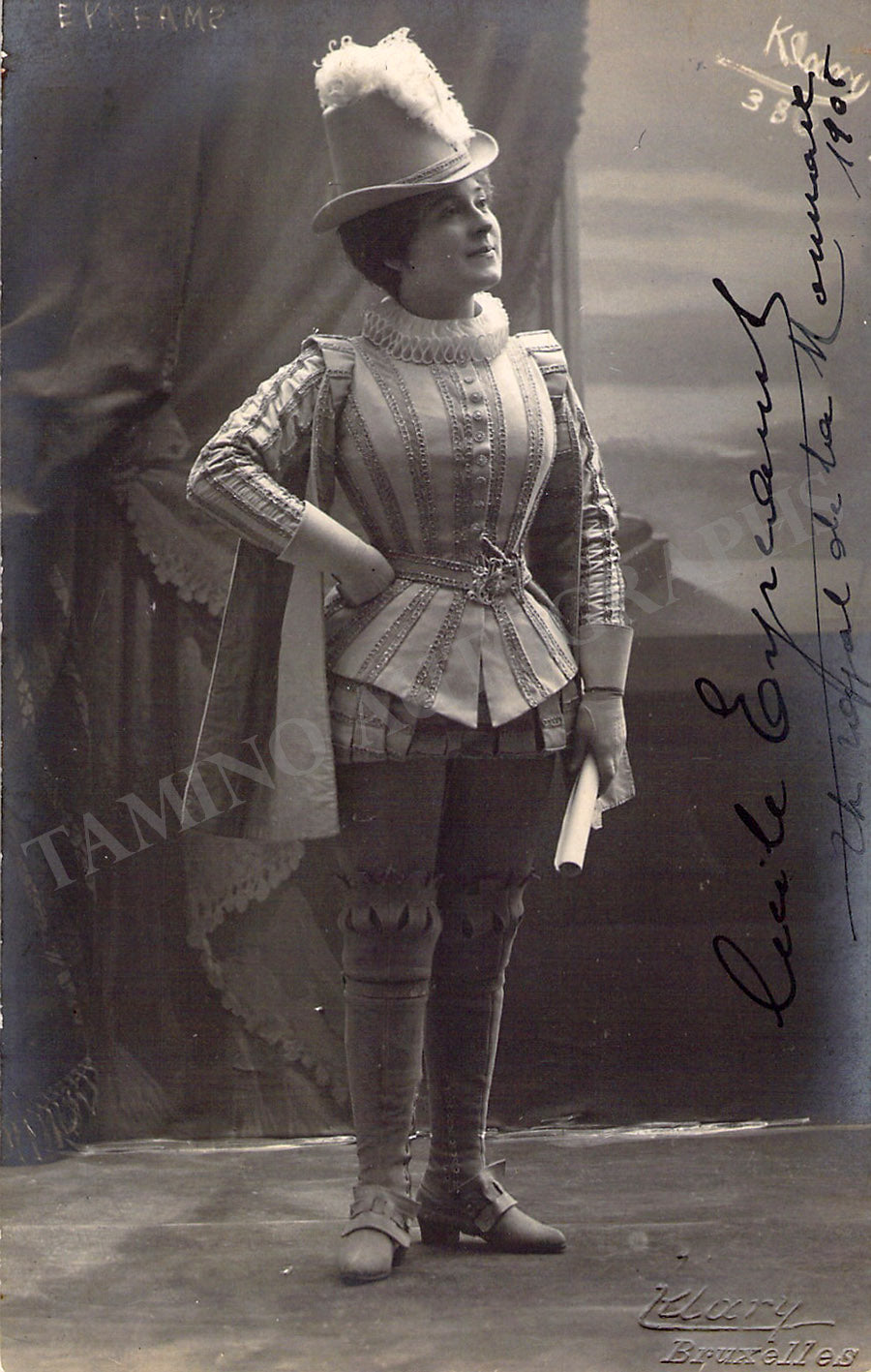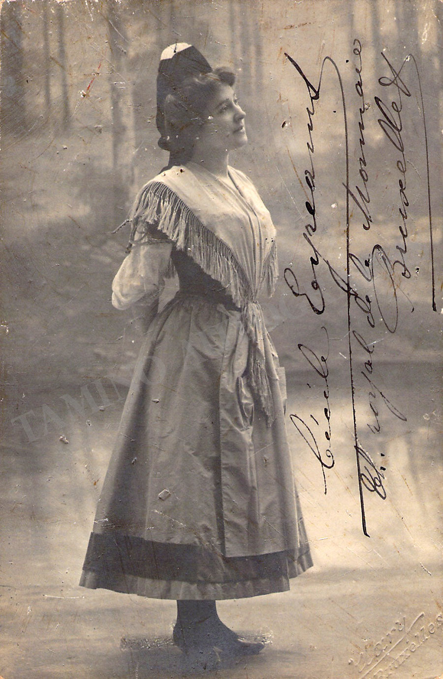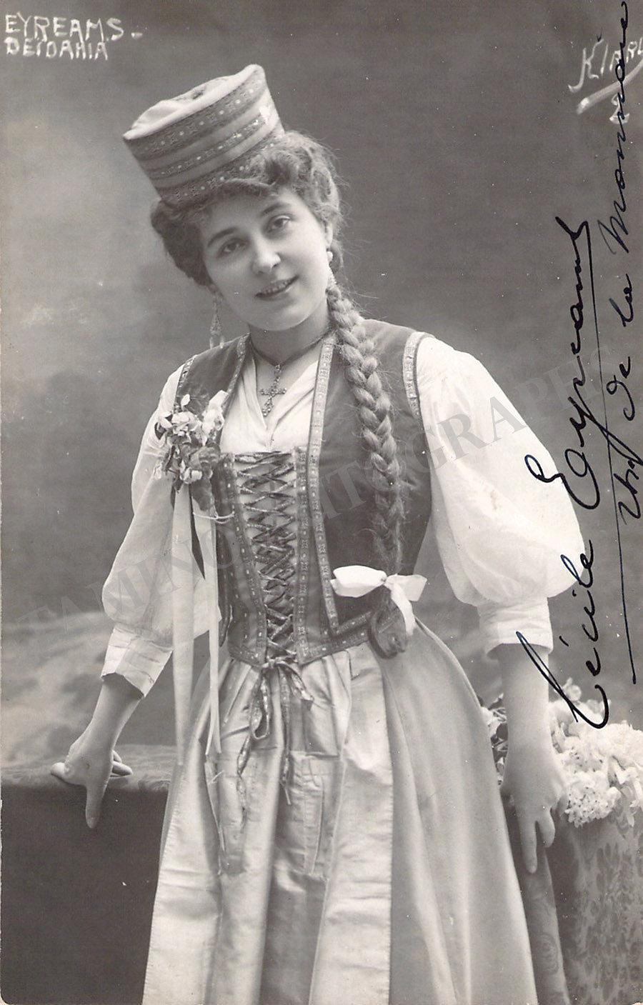 Fine black-and-white photo postcard signed by her, shown in Les Huguenots; blind-stamped on the front by photographer Klary (Brussels). Size is 3.3 x 5.3 inches, in overall very good condition.