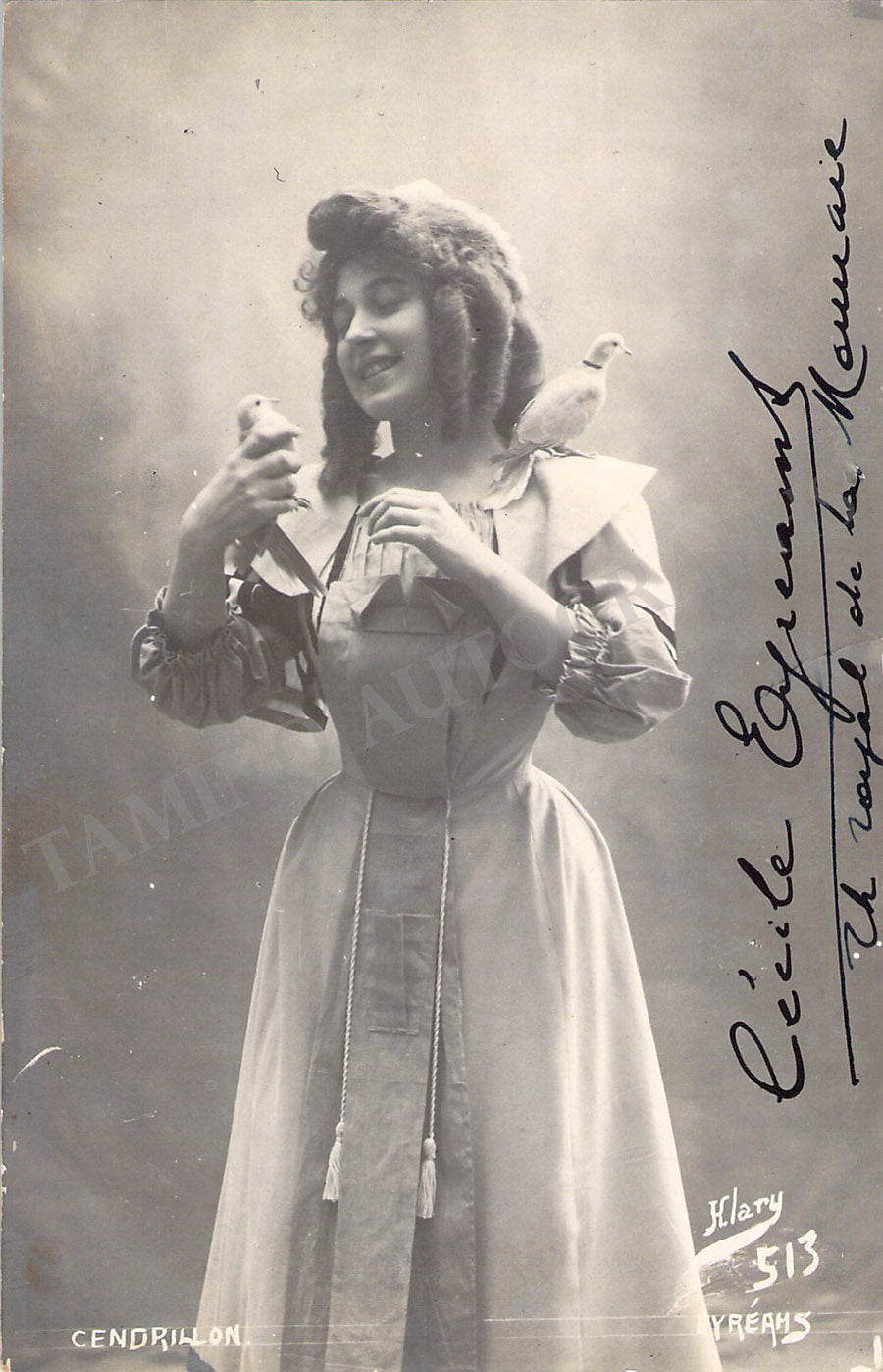Fine black-and-white photo postcard signed by her, shown in role; blind-stamped on the front by photographer Klary (Brussels). Size is 3.3 x 5.3 inches, some scratches, in overall very good condition.
