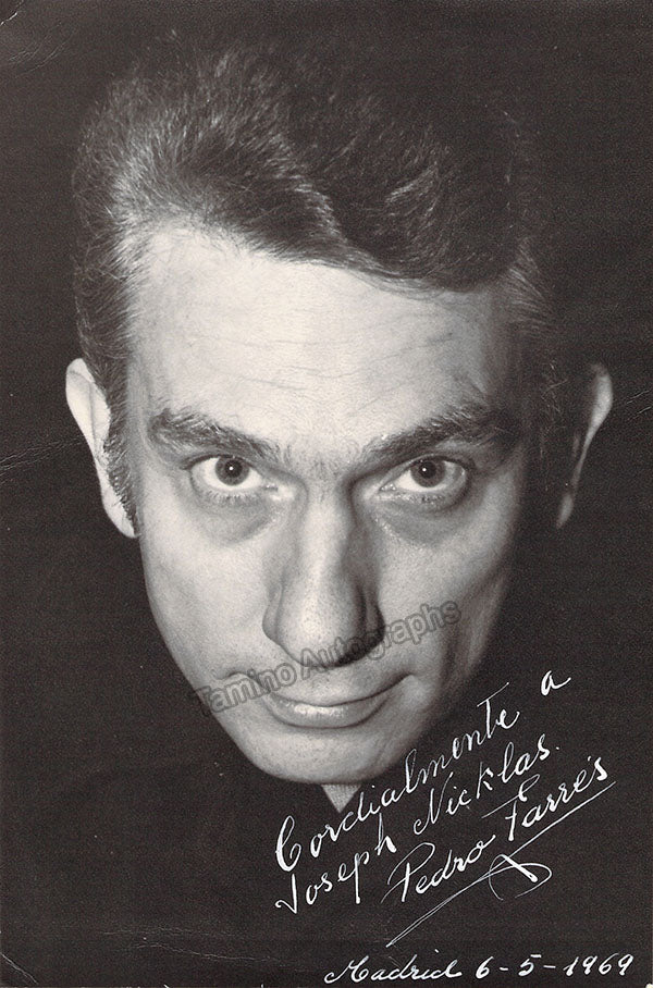Spanish baritone (1931-2018), signed photograph, shown as himself, inscribed, dated in Madrid in 1969. Bold handwriting and signature in attractive silver ink. Stamped on verso by photographer Julio Cesar, Madrid. Size is 4.5 x 7 inches, in very good condition.