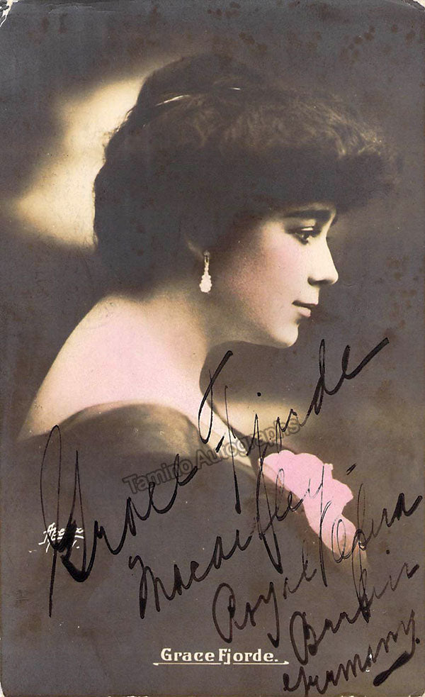 American opera signer and silent film actress, signed postcard photograph, shown as herself, inscribed in Berlin. Additional extended inscription on verso. Size is 3.25 x 5.5 inches, slight paper loss on edges, otherwise in very good condition.
