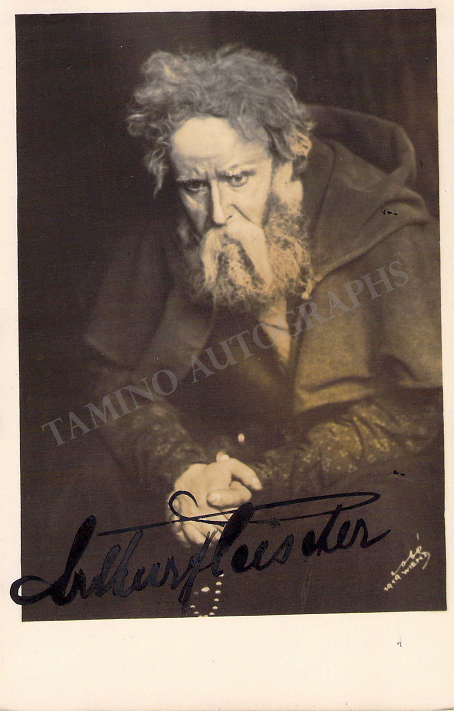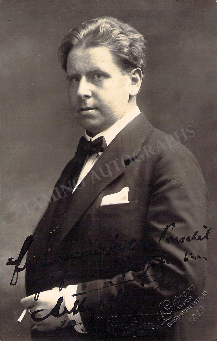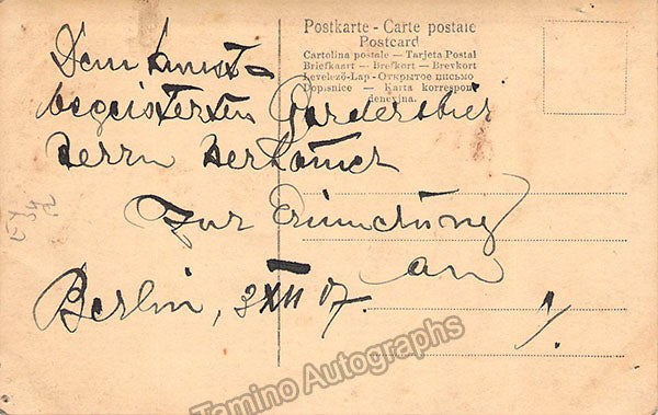 Signed postcard photograph, shown as himself, inscribed and dated in 1920. Blind stamped on front by both Magasin Metropole photo studio and photographer L. Gutmann in Vienna. Size is 3.5 x 5.5 inches, in excellent condition.
