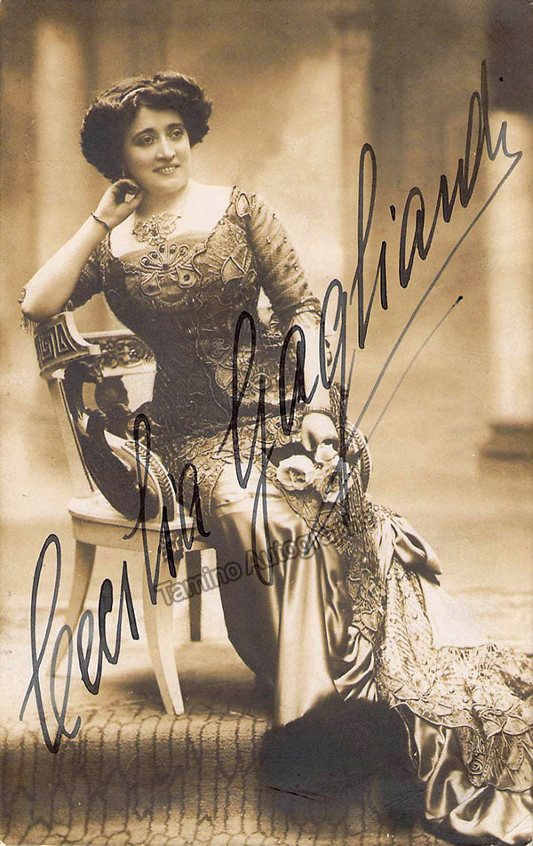 Italian soprano (1876-?), signed postcard photograph, shown as herself or possibly in role. Bold handwriting and signature. Photo by Varischi and Artico photographers, Milan. Size is 3.5 x 5.3 inches, beautiful vintage item in excellent condition.