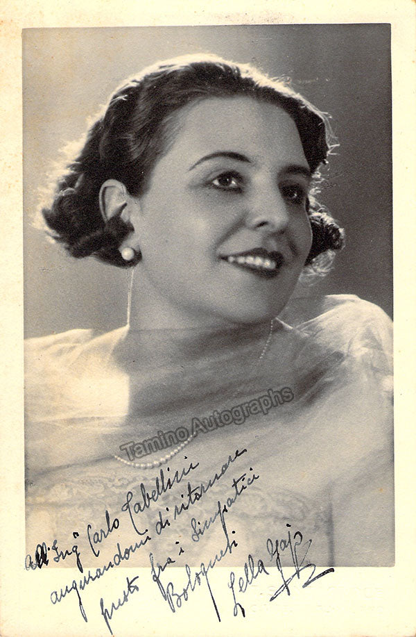 Italian soprano (1895-1966), signed photograph, shown as herself, inscribed with short sentiment. Blind stamped on front by photographer T. Santacroce, Milan. Size is  4.5 x 6.75 inches, in excellent condition.