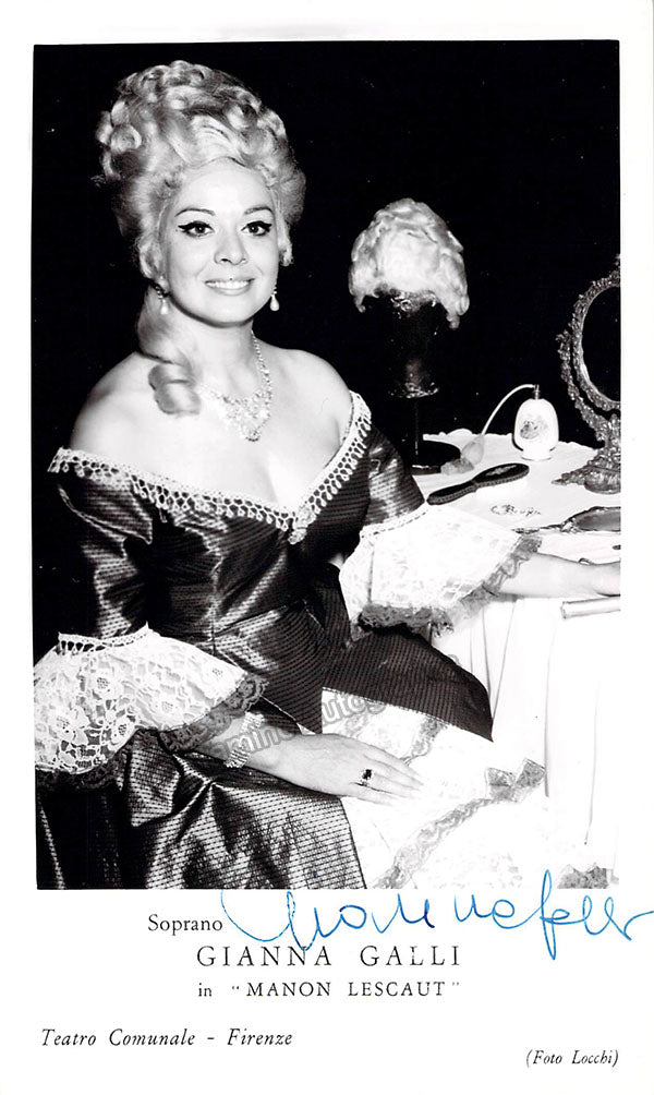 Italian soprano (1935-2010), signed photograph, shown in the title role of Puccini's Manon Lescaut at the Teatro Communale, Florence. Photo by Locchi. Size is 4.25 x 7 inches, in excellent condition.