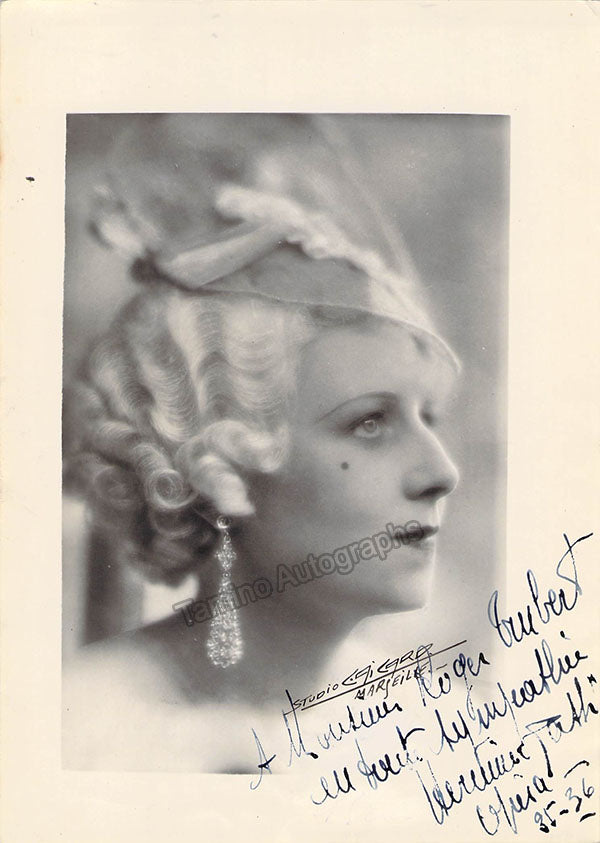 French soprano, associated with the Paris Opera Comique. Signed photograph, shown in role, inscribed and dated in 1936. Also hand signed on front by Cigicaro photo studio, Marseille. Size is 5 x 7 inches, in excellent condition.