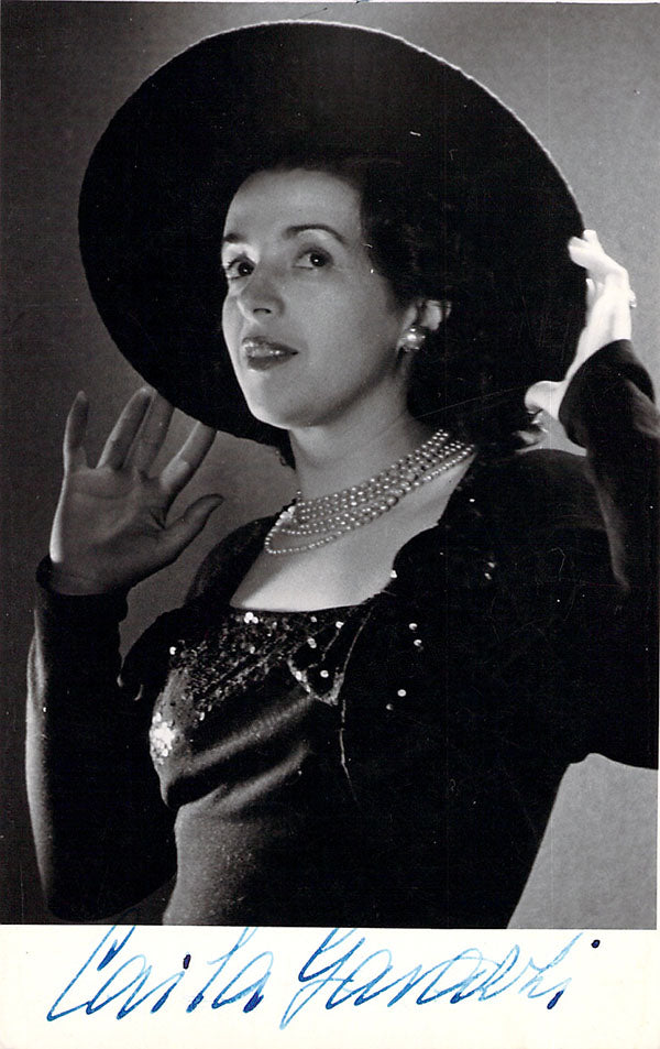 Signed photograph, shown as herself, inscribed. Photo by M. Camuzzi, La Scala, Milan. Size is 4 x 5.8 inches, small crease on bottom left, otherwise in good condition.