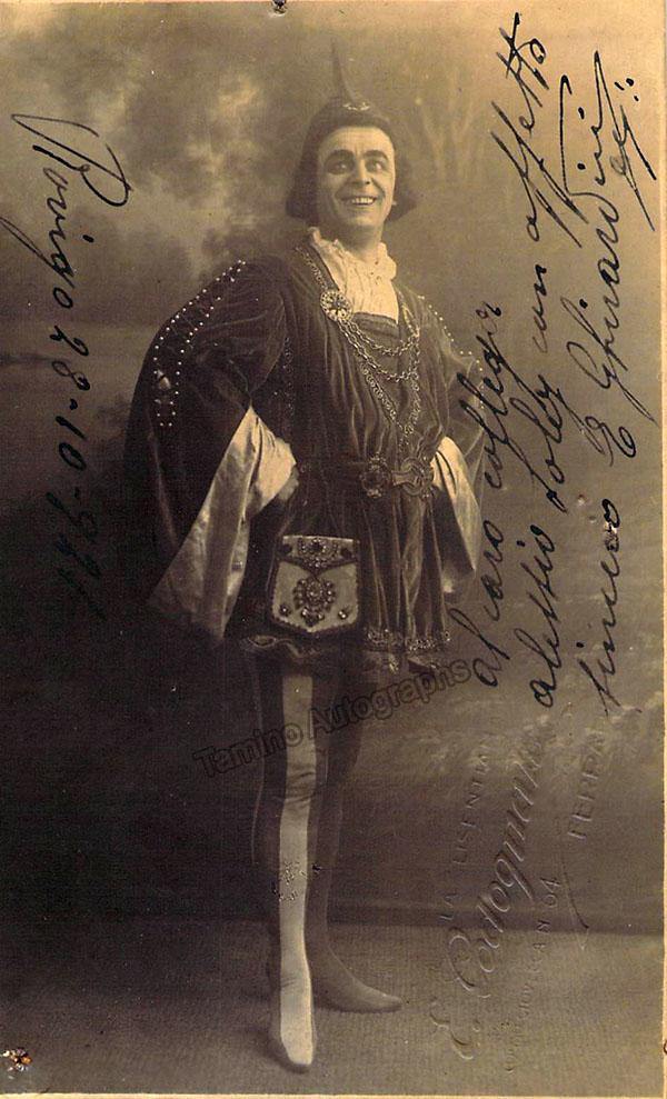 Signed photo postcard, shown in role, inscribed and dated in Rovigo in 1921. Blind stamp on front by photographer E. Codoqualo, Ferrara. Size is 3.25 x 5.25 inches, very slight cracks at top and bottom left of photo not affecting the signature.