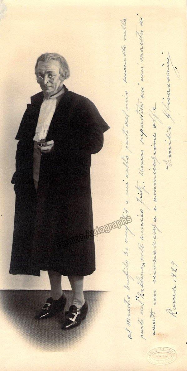 Signed photo, shown in role, extensively inscribed in Rome, dated in 1929. Clear handwriting and signature. Blind stamped by photographer Ufee, Rome. Size is 4.75 x 9 inches, rust and mounting traces on verso, and very slight paper loss on top left outside area of image and text, otherwise in excellent condition.