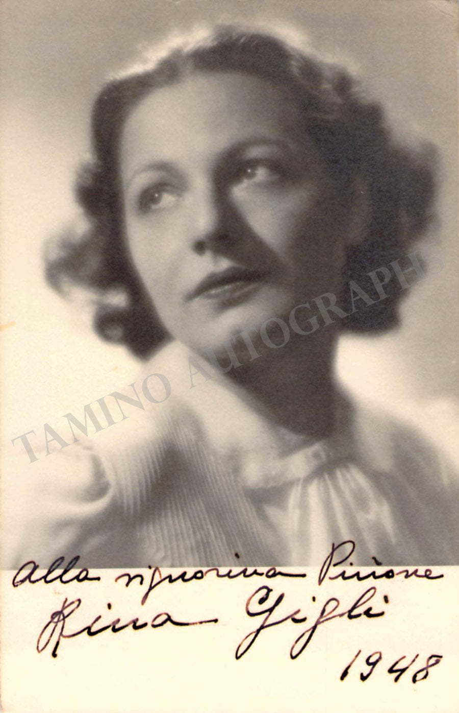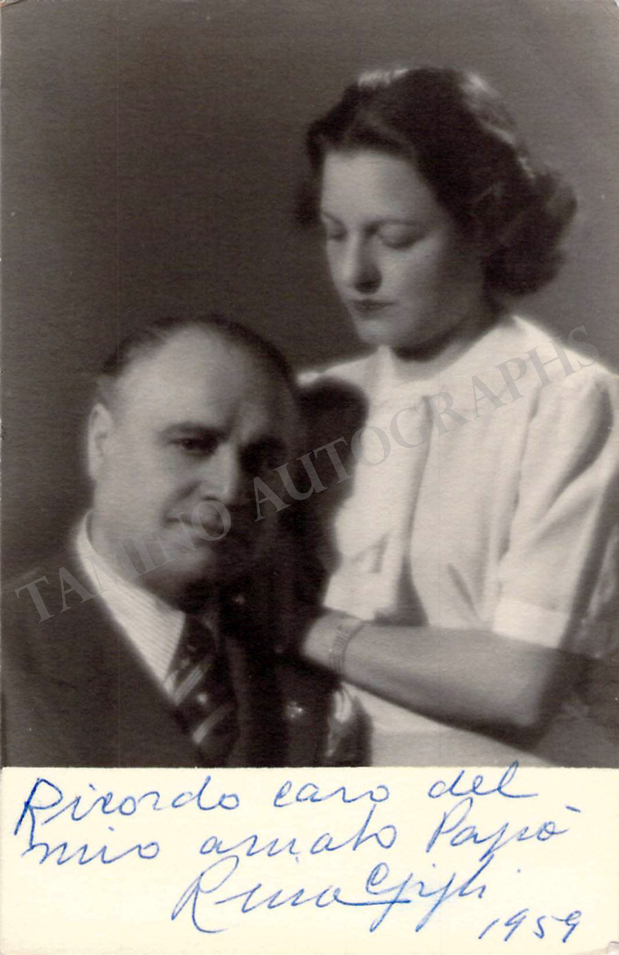 Nice black-and-white photo postcard of her father Beniamino Gigli signed and inscribed by her (Rina) with a short sentiment dated 1962. Size is 5.75 x 4 inches, in excellent condition.