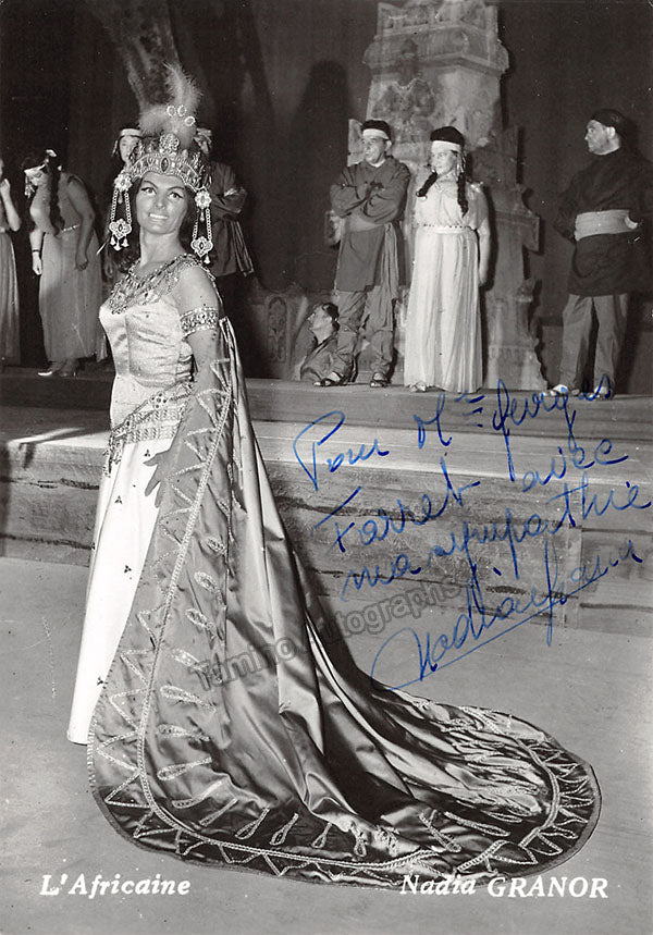 French soprano, signed photograph, shown in Meyberbeer's L'Africaine, inscribed. Size is 4 x 5.75 inches, in excellent condition.