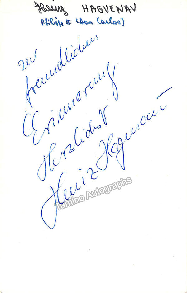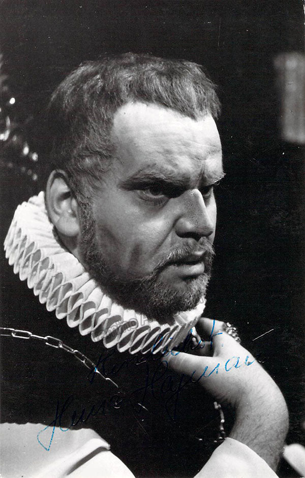 German bass (b.1929), signed photograph, shown as King Phillip in Verdi's Don Carlo, signed on front with additional signature and inscription on verso. Size is 3.5 x 5.5 inches, in excellent condition.