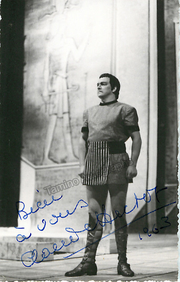 French tenor (1924-2002), signed photo postcard, shown as Radames in Aida, dated in 1963. Size is 3.5 x 5.5 inches